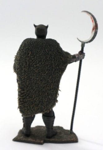 The design of the "Skullman" statue is based on this depiction. Liam Sharp is known for his detailed and dynamic drawing style. From the boot buckle to the cruel claws, the statue accurately depicts the Nordic version of the Grim Reaper after his work is done. You can even see the fresh blood dripping from the sickle. In 1/12 scale, the statue is complemented by a high-quality cardboard diorama with a matching background, which further enhances the atmosphere and horror of the design.