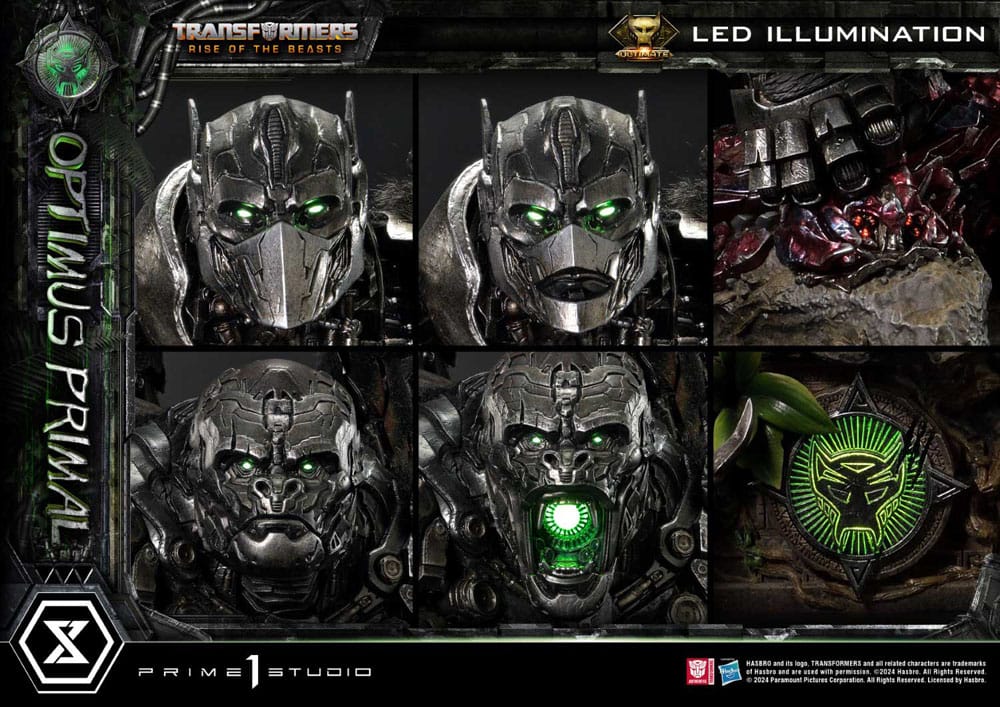 The Ultimate Version takes this piece to a whole new level with the addition of a swappable base featuring Optimus Primal's magnificent beast mode. Towering atop a lifeless Scorponok and surrounded by lush jungle vegetation, this base showcases his unyielding strength and victorious spirit, blending organic and mechanical elements in a visually captivating manner. Added swappable head parts offer expanded storytelling, including two variations for each form, all featuring LED illumination in the eyes and mouth.