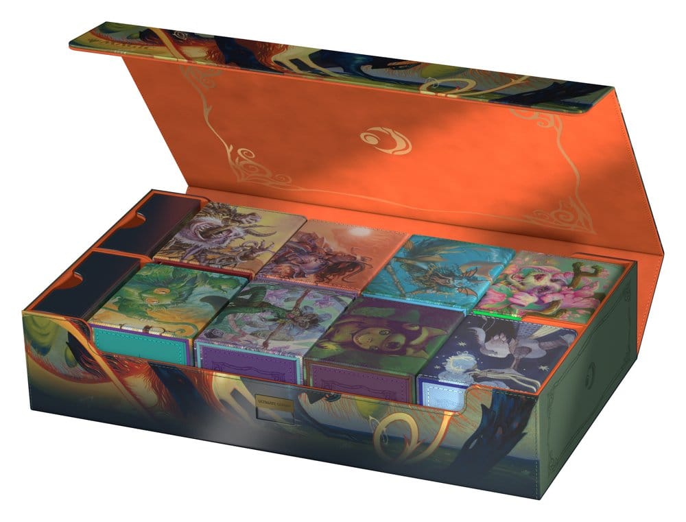 Ultimate Guard's Omnihive 1000+ Xenoskin with officially licensed artwork from Magic: The Gathering's "Lorwyn Eclipsed" set is the ultimate MTG mass storage box for decks, cards, and accessories. Designed to hold multiple MTG deck boxes and/or play-mats simultaneously, it features two flexibly positionable and stackable magnetic dice trays over two compartments, durable Xenoskin material, high-quality microfiber inner lining, a strong magnetic closure and Ultimate Guard's trusted ZnapClaw mechanism. With capacity for eight Sidewinder 100+ or six Sidewinder 133+ deck boxes, the Omnihive 1000+ Xenoskin also holds up to 1000 double-sleeved cards in Ultimate Guard sleeves*, making it the perfect storage box for a cube.