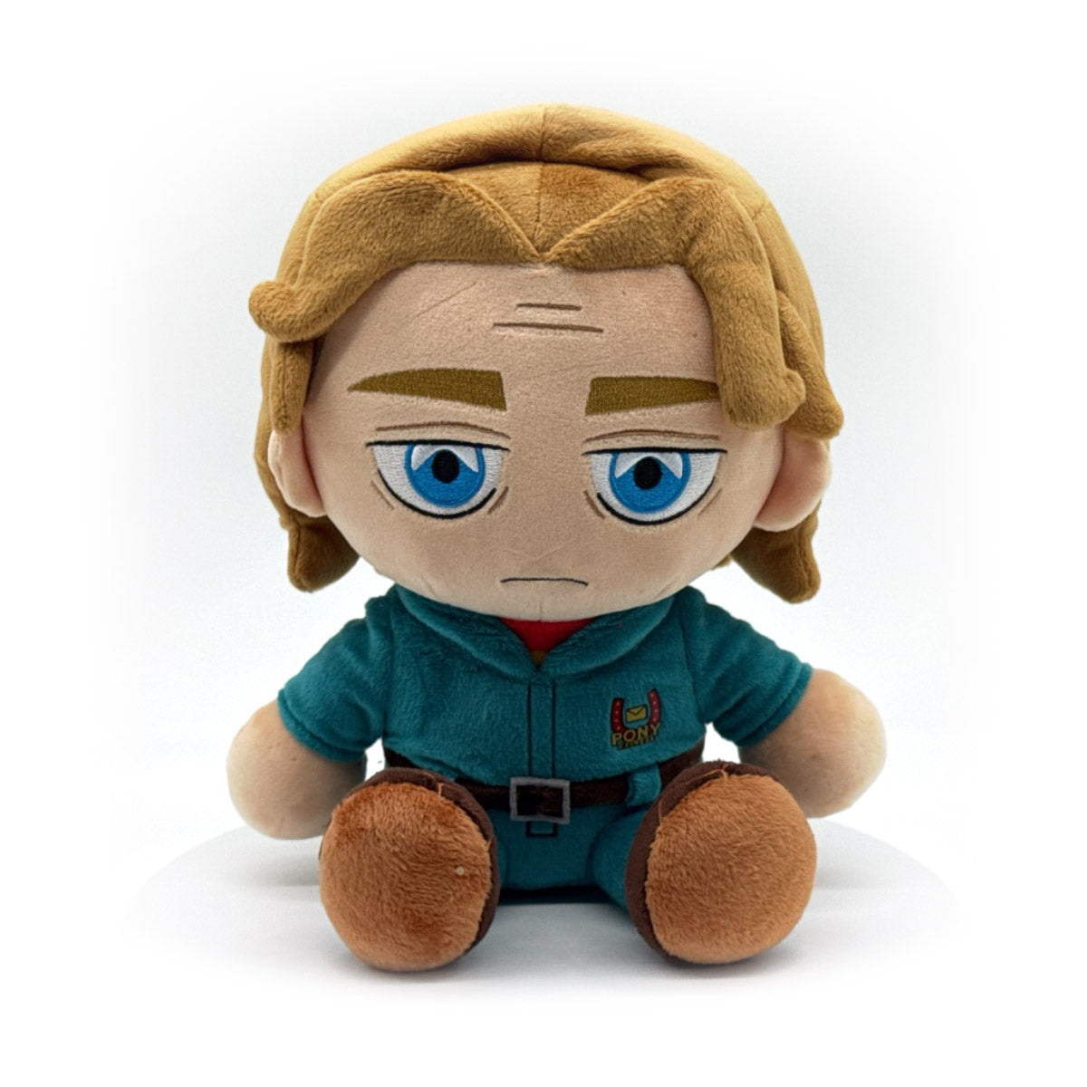 What a handsome lad! And so full of promise! Surely nothing bad is going to happen to him… Right? Sitting at 9 inches tall with tired blue eyes and a blank mouth at the centre of his slightly wrinkled face, light brown hair parts in the middle with the fringe falling over his forehead as the rest hangs past his shoulders. Dressed in blue Pony Express coveralls with a small logo on the chest over his yellow and red shirt, the brown belt wrapping around his waist matches the boots on his feet. This plush is packed to the seams with 100% PP cotton and is made of the softest minky material with accents of felt, absolutely perfect for cuddling or being a great captain with!