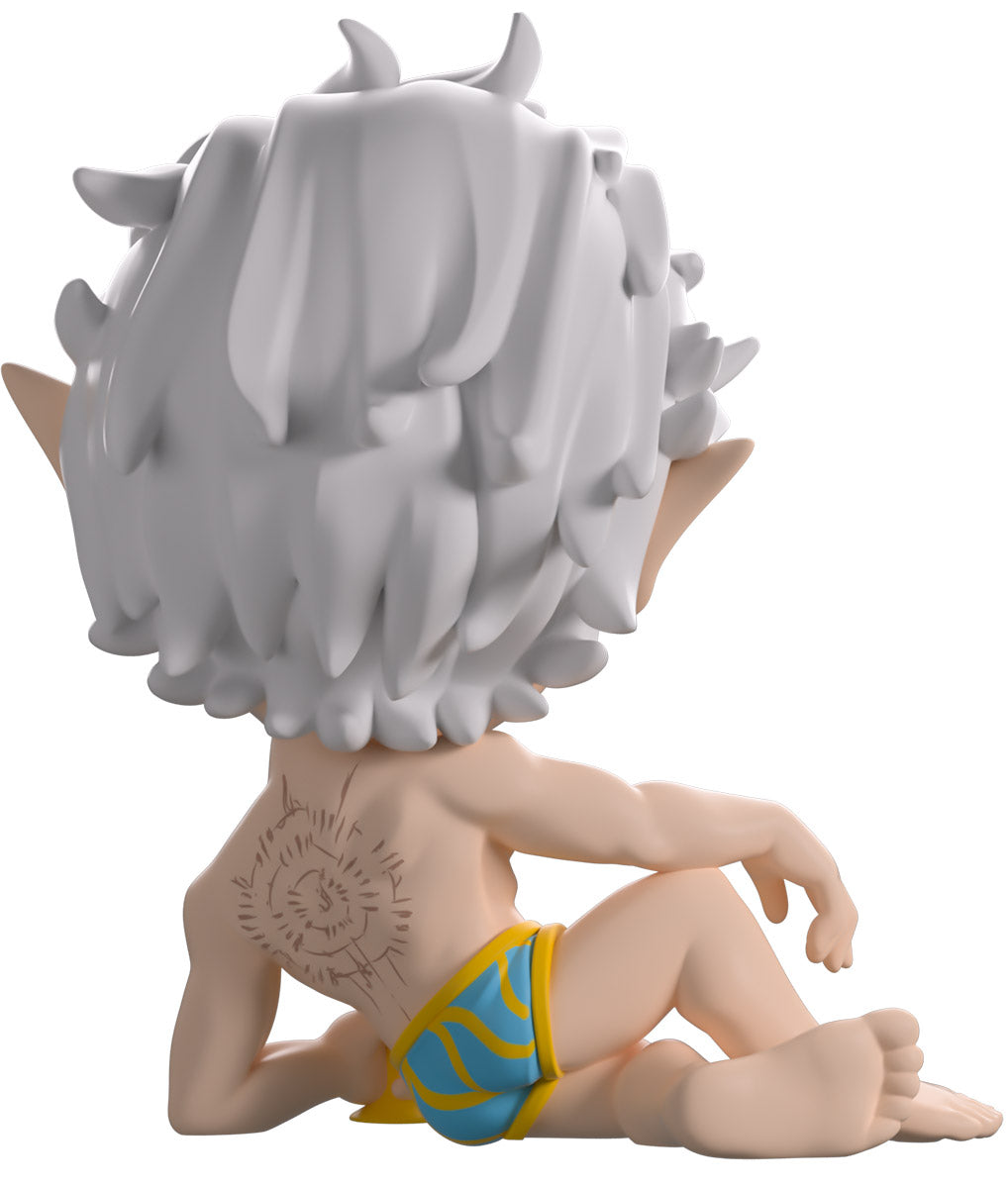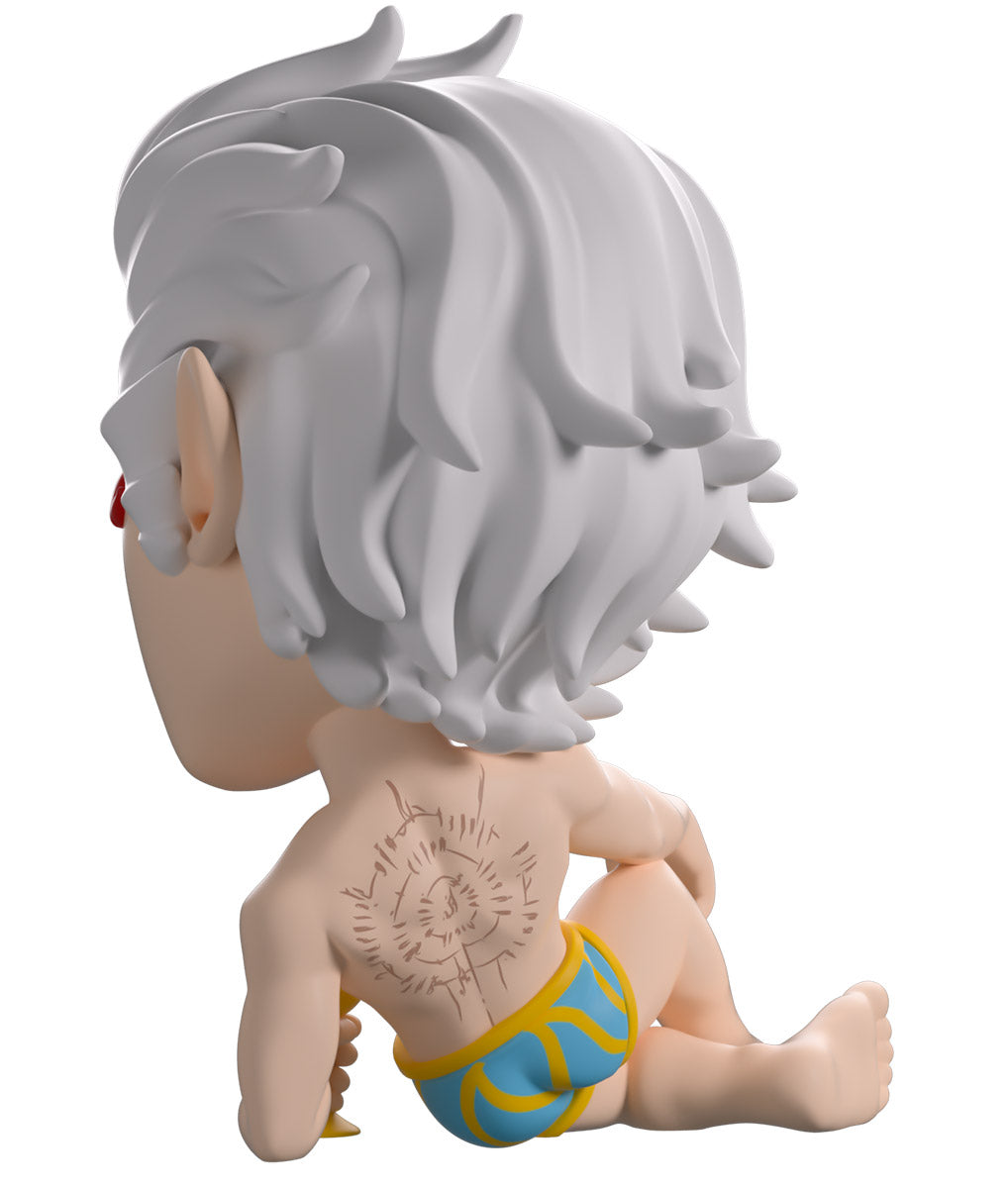 Lying relaxed and devilishly welcoming at 4 inches tall as he holds a golden goblet to his front that has deep red blood spilling over the lip, his fangs poke out from a seductive smirk as he raises an eyebrow over vibrant red eyes. With silver-white hair sweeping to the side effortlessly over pointed ears, he wears nothing but blue and yellow striped shorts, leaving his muscular torso exposed. The exterior of his packaging sees him lounging on an elegant bed, while the interior is covered in floating red petals over a pink background. These then flow onto the protective sleeve, where his figure can be seen through the large, clear window at the packaging’s front. This collectible ships in a matte, embossed, protective outer sleeve and a custom-sized plastic protector for maximum protection during shipping.