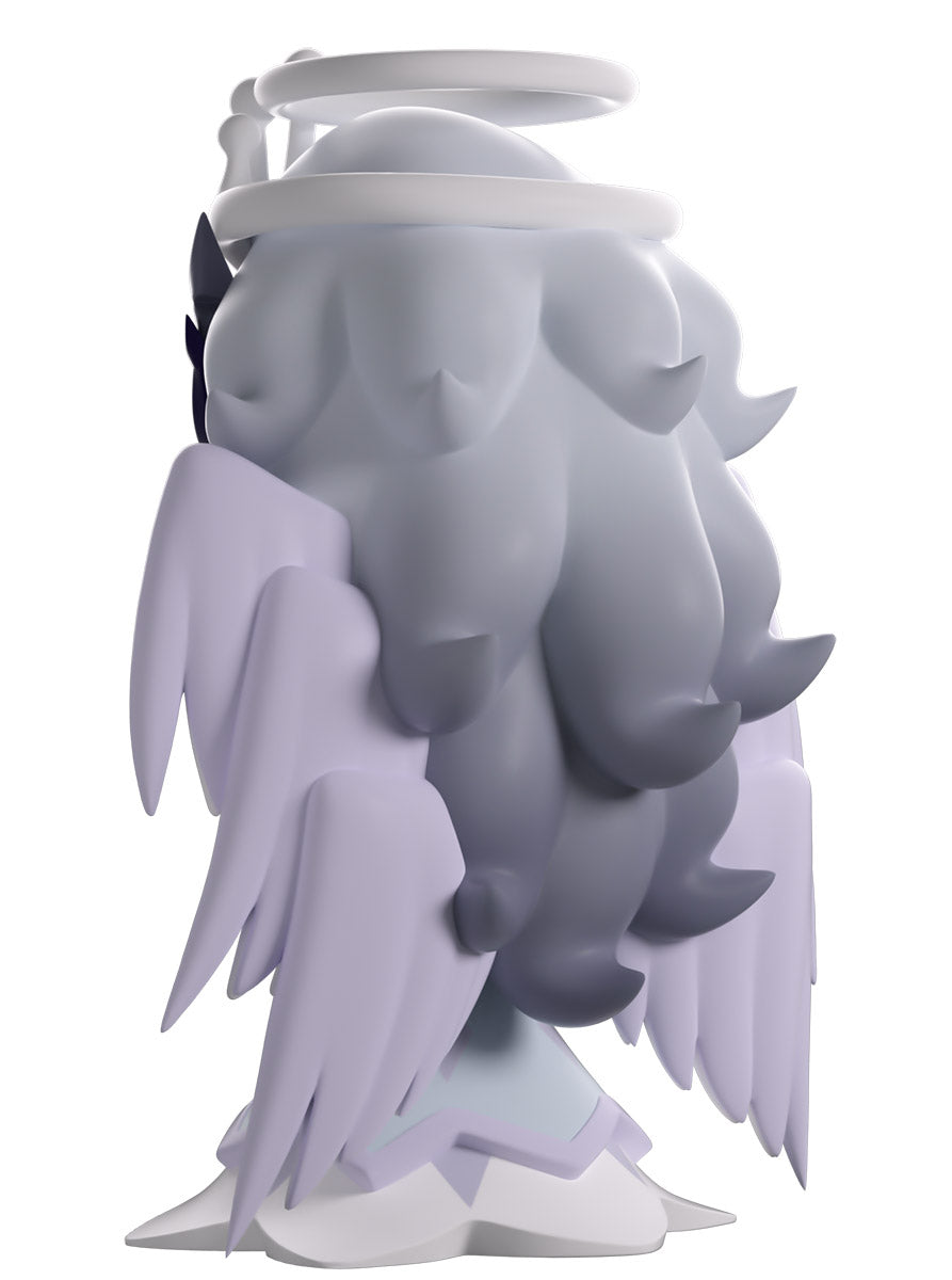 are we? Standing at 5 inches tall with her hands crossed at the front as a pair of large grey and blue eyes look out from above, freckled cheeks, a pair of halos rest atop the long grey-white hair that falls down past her waist, as elegant pink and white wings fan out from her shoulders. Wearing an angelic dress that has a high collar and sleeves that come over her hands, its rounded white shoulders match her forearms as a diamond pattern runs down its two tiered silhouette. The exterior of her packaging looks down on an intricate golden dial, while the interior is filled with swirling clouds against an orange and purple sky. The protective sleeve is then designed to show off a dark cityscape as her figure can be seen through the large clear window at the packagings front. This collectible ships in a matte, embossed, protective outer sleeve and a custom-sized plastic protector for maximum protection during shipping.