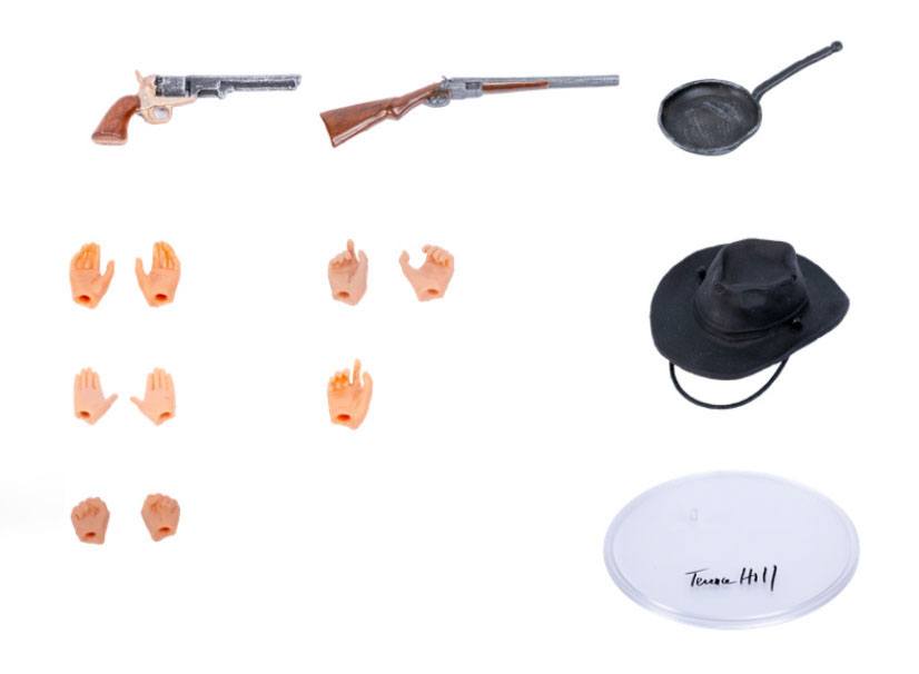 Terence Hill's officially licensed action figure was inspired by his role as Trinity from the classic movie "They Call Me Trinity". The 18 cm tall figure has 14 points of articulation and comes with additional accessories in a window box with hanger. A transparent base with a printed signature holds Trinity to a secure stand with a reversible, double-sided printed diorama ensuring an appealing presentation of the figure, either in front of a desert or western city background.