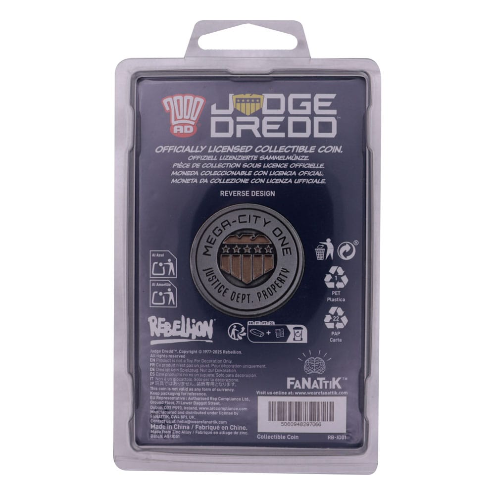 This limited edition coin depicts Dredd's silhouette on the front and the Mega-City One Justice Department logo on the reverse. Each coin is limited to 9,995 worldwide and is individually numbered on the front.