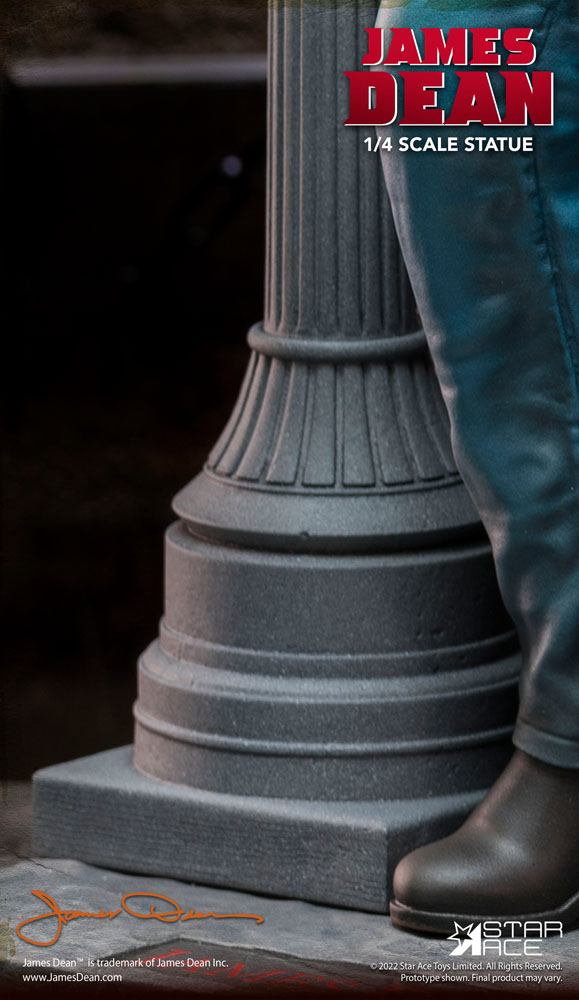 Star Ace brings James Dean to life in this ¼ scale polyresin statue which includes a diorama base placing the teenaged "rebel" standing on a street corner, smoking a cigarette. This statue features a detailed and accurate likeness of the actor and depicts him in the memorable outfit of red jacket, white t-shirt, jeans, and black boots.