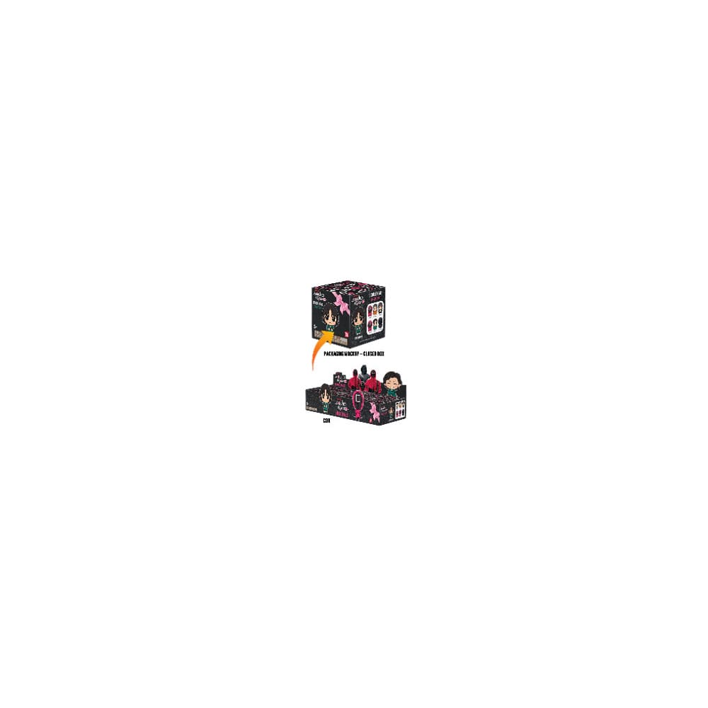 Display with 12 minifigures from "Squid Game". Each figure is 6 cm tall and packaged in a blind box packaging.